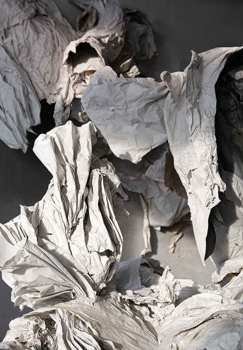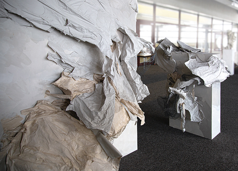 Ausbruch, 2020, Rauminstallation aus Papier, Stoff und Draht